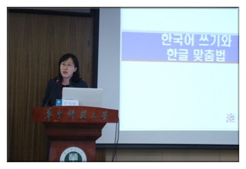 教师们经过短暂的休息后,又全身心投入了紧张的研讨发表中。下午两位教师依次发表,内容不同,一样精彩。来自首尔大学的张恩雅教授发表了以韩国语教学资料的活用为题的报告,各种视频或文字资料或有趣,或流行,整体风格幽默有趣,容易理解,使人印象深刻。秋志敏教授发表了以韩国语语言概论为题的报告,深入浅出,循序渐进,丰富而精准。